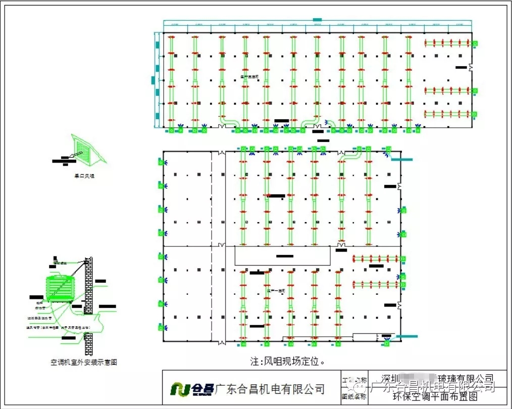 广东合昌对该厂房3个车间的具体情况设计环保空调进行通风降温改善室内空气状况,采用54台18000 m³/h风量环保空调整体降温方案,直接送风方式进行降温、通风、换气、防尘效果。在厂房外侧面安装环保空调并引风管至车间室内,通过其工作效能,将外部空气进行降温并将空气中的粉尘及其他污染物过滤后源源不断的送入室内,形成正压气流,将屋内闷热污浊空气自动排出,令厂房内部形成新风气流通道,将室内的高温、异味、油污和混浊闷热的空气源源不断的排出室外,达到通风降温的效果,在高温天气时使室内空气温度下降4-10℃左右。有效解决车间工作环境问题。其耗电量仅是传统空调的1/8,投资费用仅传统中央空调的2/5。